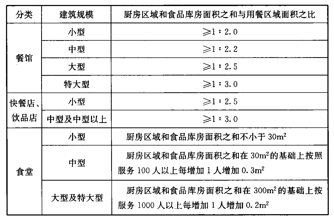 注:1表中所示面积为使用面积。2使用半成品加工的饮食建筑以及单纯经营火锅、烧烤等的餐馆,厨房区域和食品库房面积之和与用餐区域面积之比可根据实际需要确定。