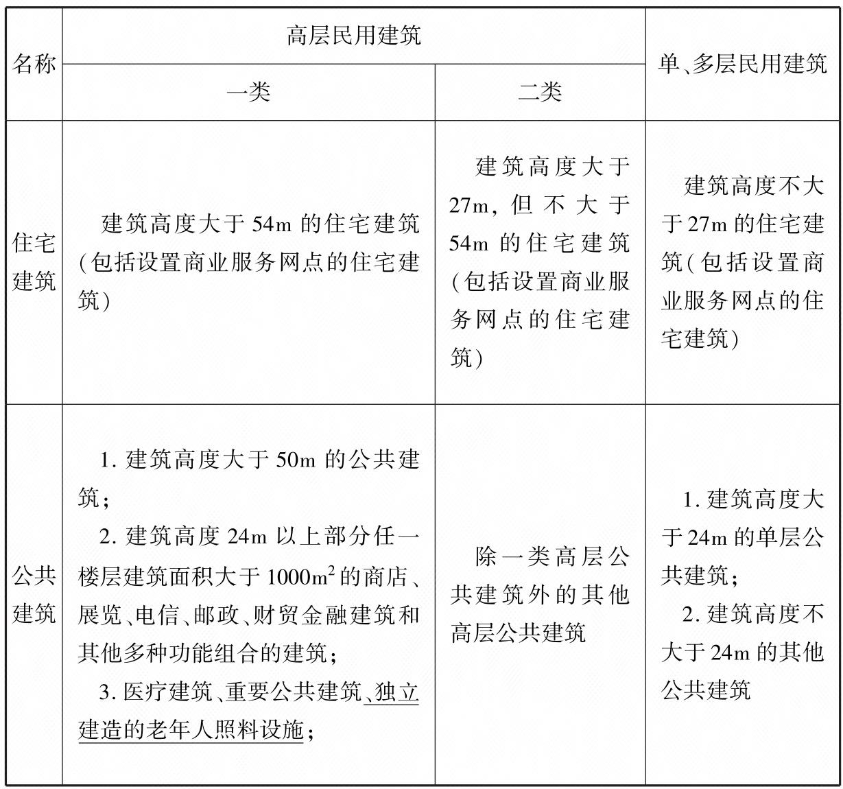 5.1.1 民用建筑根据其建筑高度和层数可分为单、多层民用建筑和高层民用建筑。高层民用建筑根据其建筑高度、使用功能和楼层的建筑面积可分为一类和二类。民用建筑的分类应符合表5.1.1的规定。